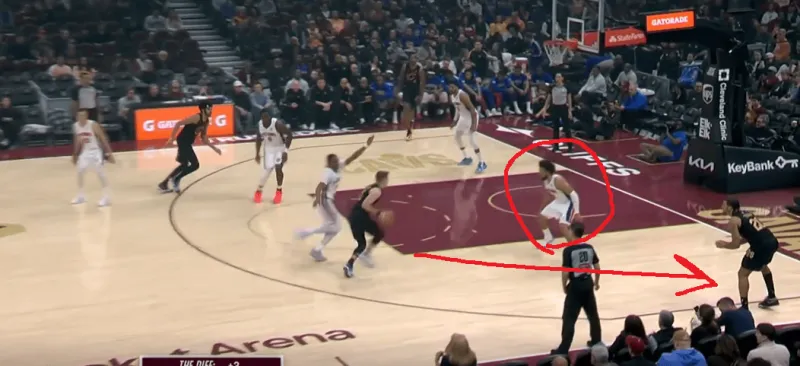 这一次也是同样的道理,在阿伦引导右侧的掩护下,泰森变向走左侧过掉了CC,从而吸引了活塞的防守收缩,